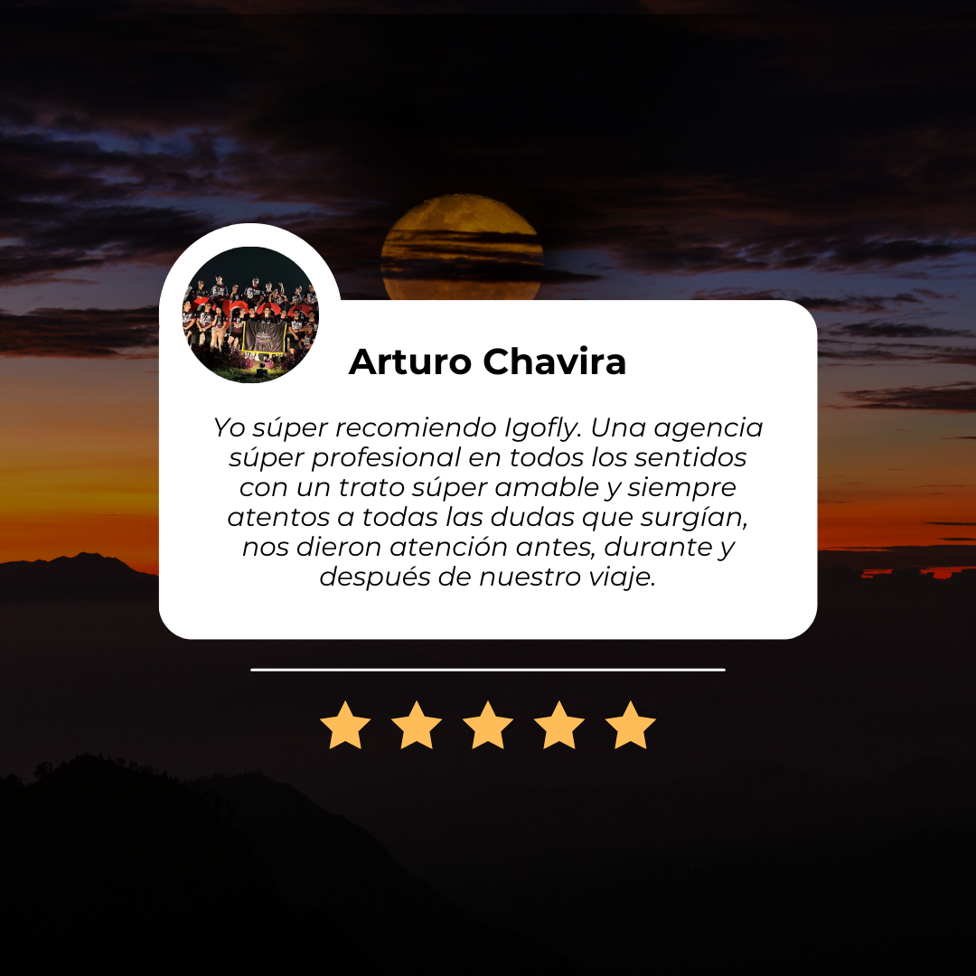 Fundada en 2019 en Cd. Juárez - El Paso, IGOFLY nació en un punto de encuentro entre dos culturas, fusionando la esencia del norte de México y el sur de Estados Unidos. Somos más que una agencia de viajes; somos un equipo de viajeros apasionados que han explorado el mundo y queremos compartir nuestra experiencia con usted.